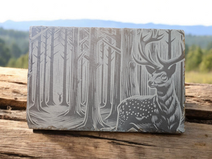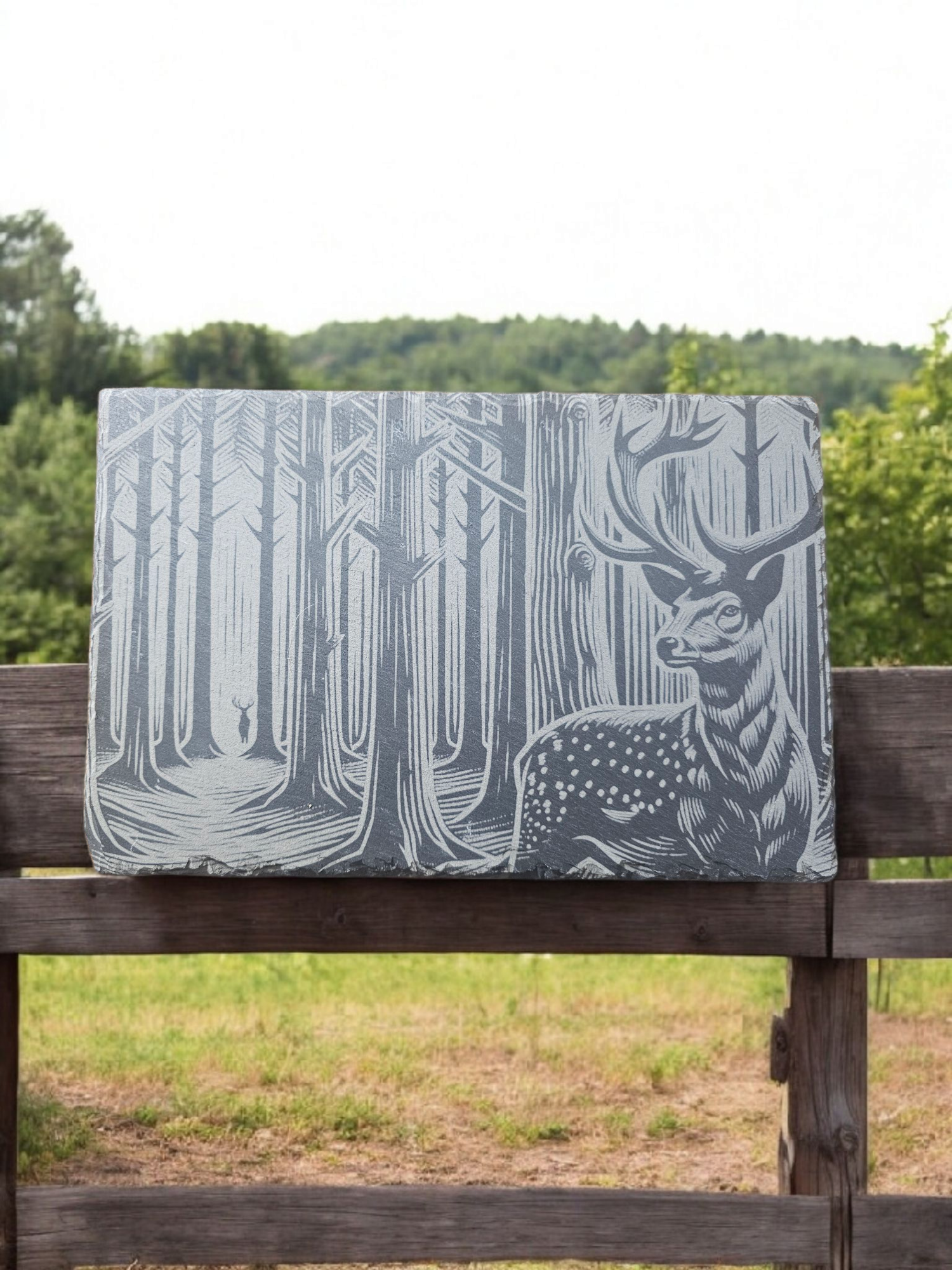 This laser-engraved slate board features a detailed image of a deer standing quietly in the woods—a perfect piece for anyone who loves the outdoors. Use it to serve snacks or display it as rustic home décor.
