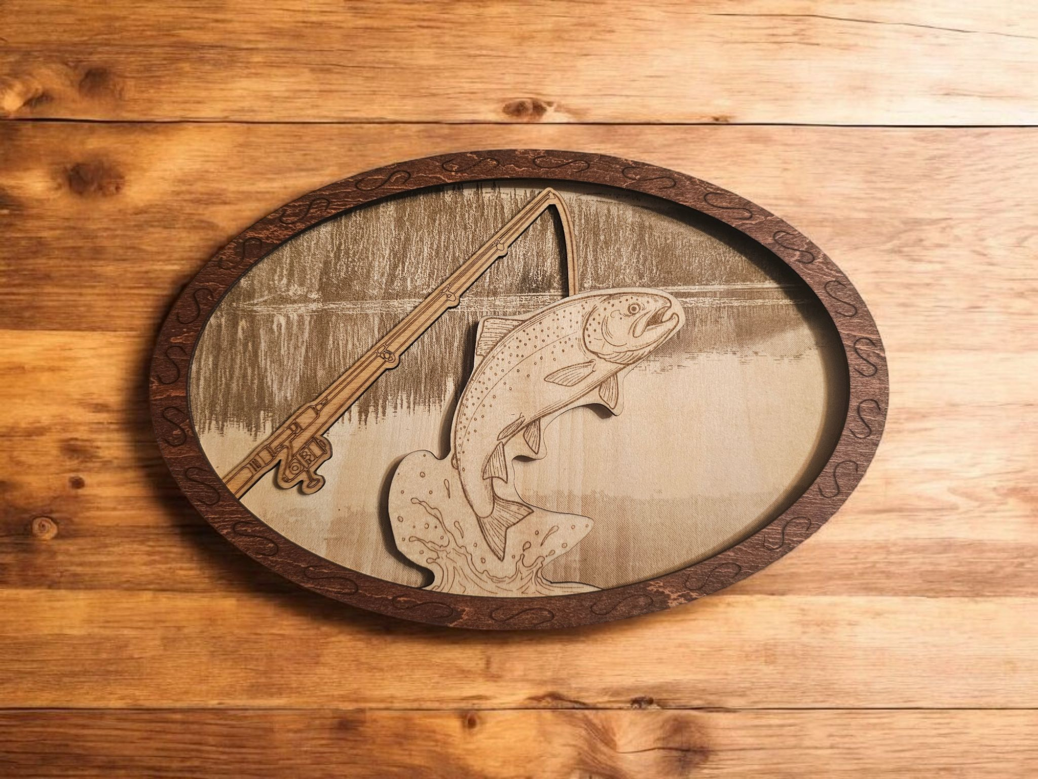 Looking for a unique and thoughtful gift? Our laser-cut and engraved multi-layered fishing decor brings the beauty of nature to any space. Crafted from premium wood and stained for depth and contrast, this stunning oval piece showcases a trout leaping from the water in intricate detail. Perfect for fishing enthusiasts, cabin décor, or anyone who loves the great outdoors, this artwork blends rustic charm with expert craftsmanship.